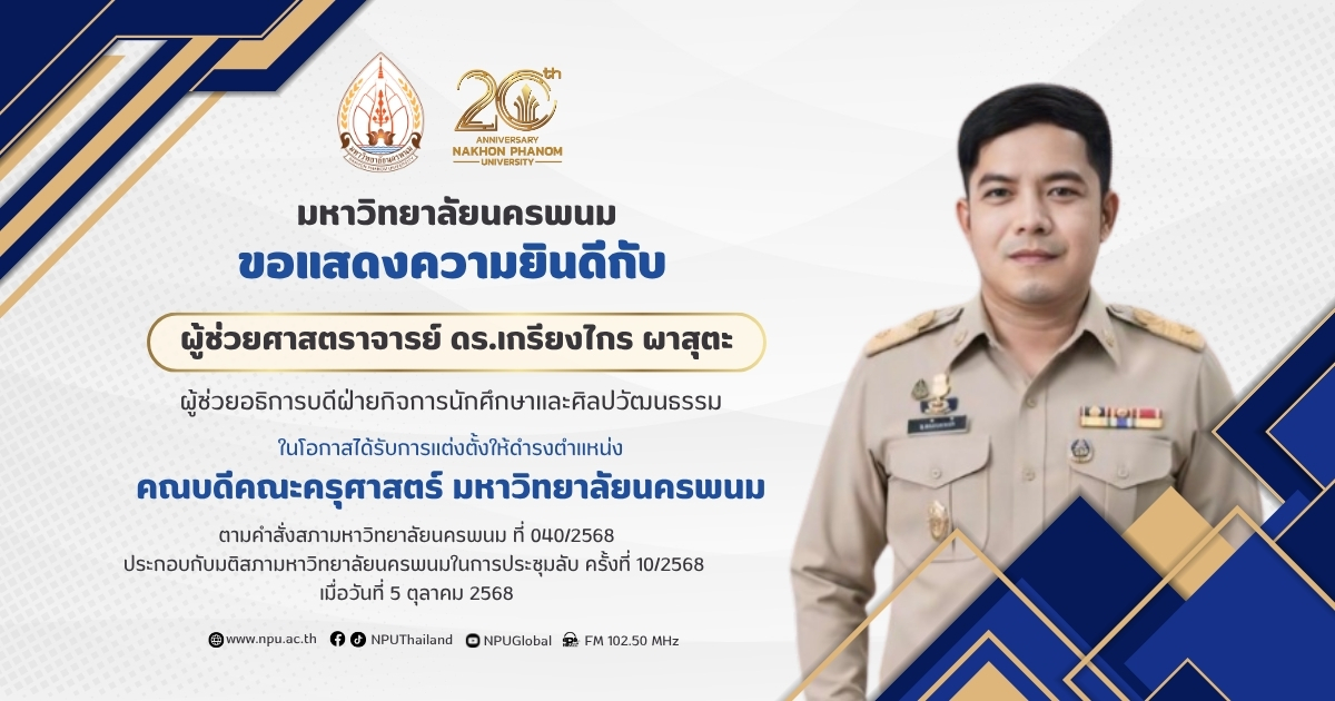 ได้รับการแต่งตั้งให้ดำรงตำแหน่ง "คณบดีคณะครุศาสตร์ มหาวิทยาลัยนครพนม"