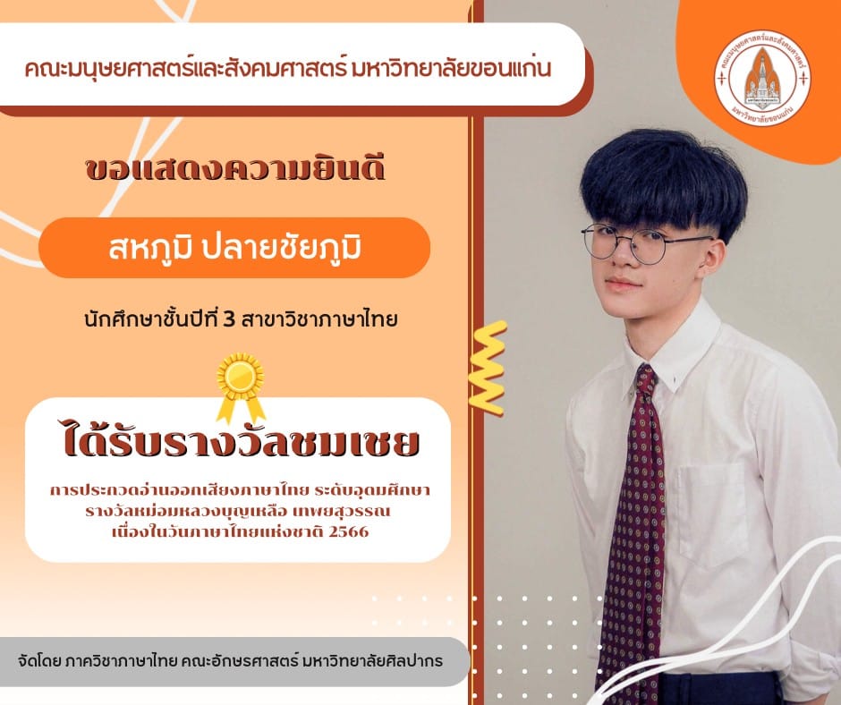 นายอาคม แปลงอาวุธ รางวัลชมเชย การแข่งขันประชันกลอนสดระดับอุดมศึกษา กองทุนสุนทรภู่ศึกษา คณะครุศาสตร์ มหาวิทยาลัยราชภัฏมหาสารคาม วันที่ได้รับรางวัล 22 ก.ค. 2565