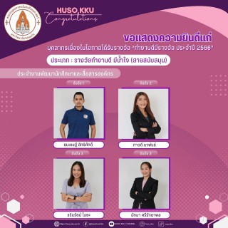 นายธนเชษฐ์ สิทธิศักดิ์ รางวัลทำงานดี มีน้ำใจ (สายสนับสนุน) ประจำงานพัฒนานักศึกษาและสื่อสารองค์กร อันดับ 1 คณะมนุษยศาสตร์และสังคมศาสตร์ มหาวิทยาลัยขอนแก่น วันที่ได้รับรางวัล 25 ธ.ค. 2566